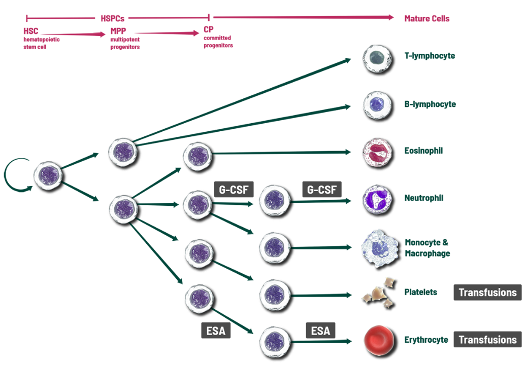 These key cells in the bone marrow are the source of blood cell lineages including neutrophils, red blood cells, and platelets. Unfortunately, these rapidly dividing HSPCs are vulnerable to damage when chemotherapy is used to kill tumor cells, which can result in the depletion of multiple blood cell lineages and a range of adverse events including neutropenia, anemia, and thrombocytopenia.
